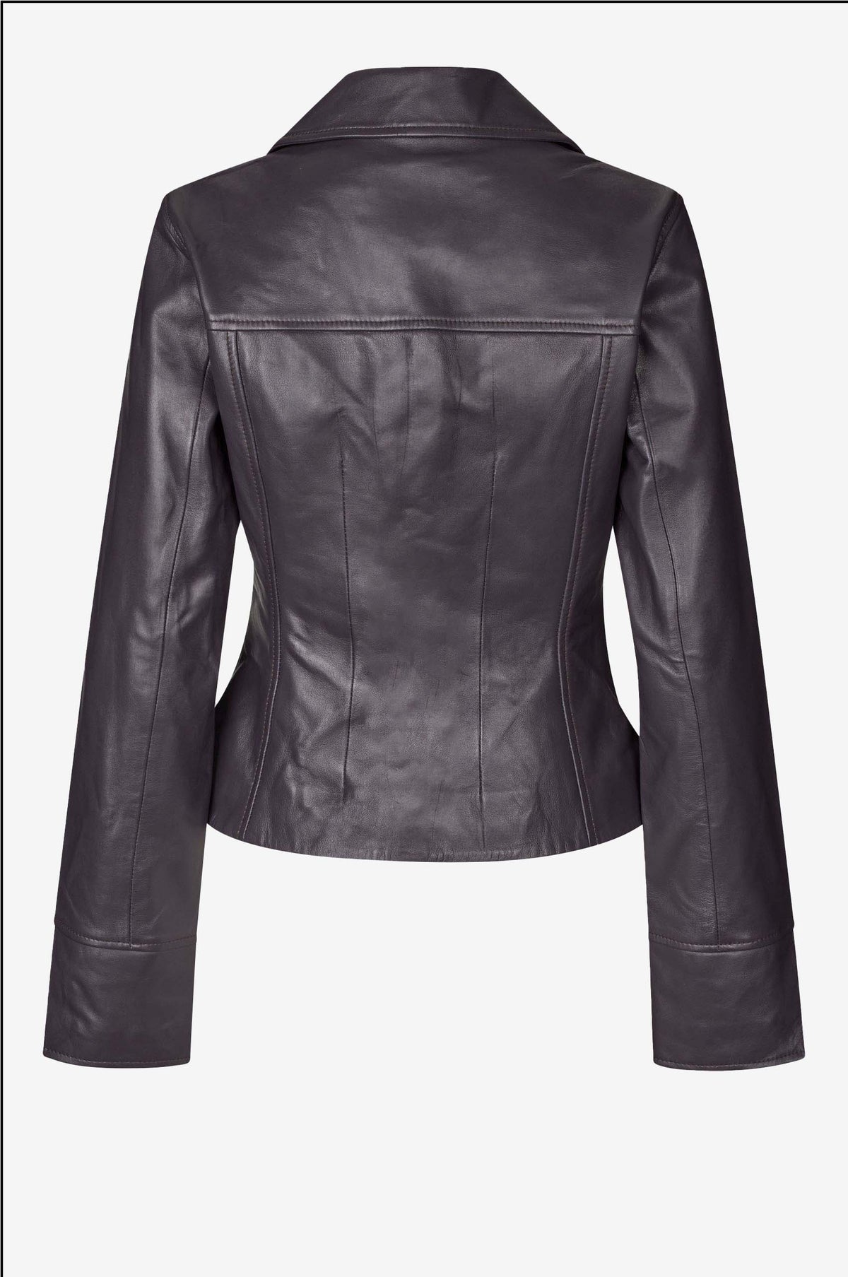 Fitted leather blazer. Made in soft and smooth leather with tonal stitching. Featuring a notch lapel and concealed press stud fastening. Long sleeves with wide cuffs with slits at ends. Fitted seams at front and back. Fully lined. Slim fit with defined waist.