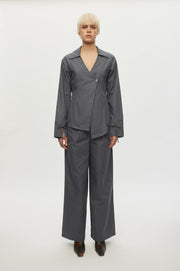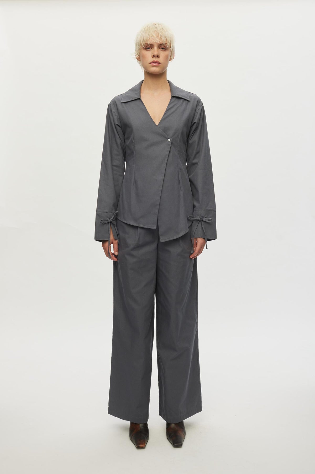 Asymmetric shirt with long sleeves. Made in light and smooth organic cotton with tonal stitching. Featuring a regular collar with crossover neckline and single button fastening at one side. Long sleeves with wide cuffs and tie fastening at ends. Tailored seams at front and back for a slim, fitted silhouette.