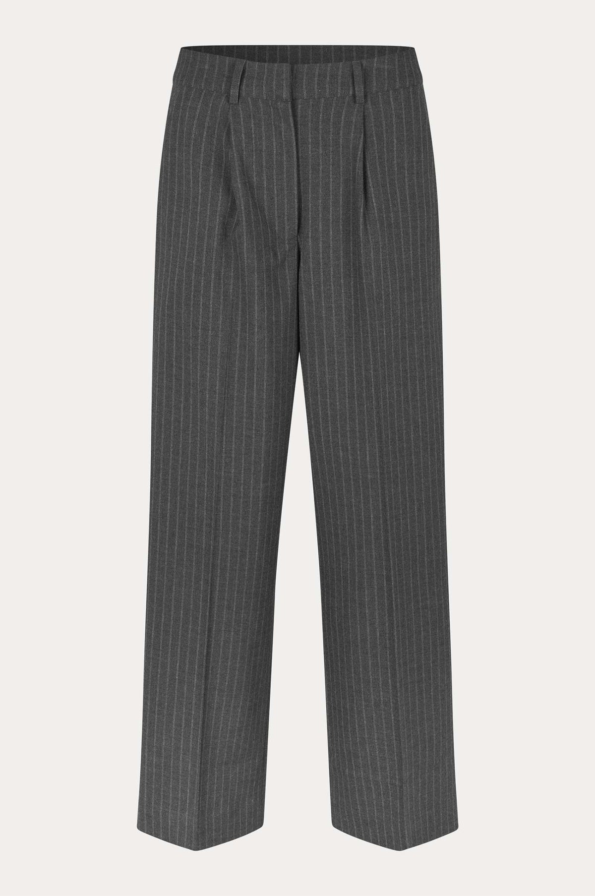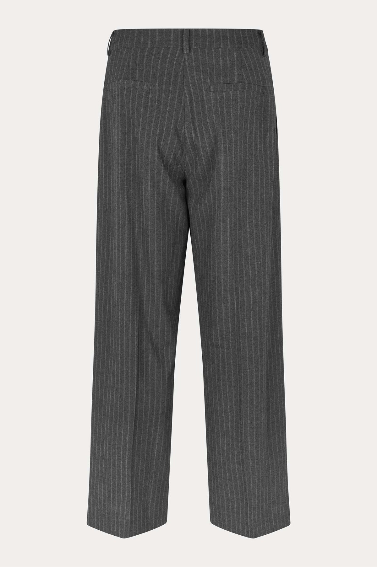 Pinstriped baggy trousers. Made in soft, smooth fabric with all-over pinstriped pattern. Featuring a concealed zip, hook and button fastening, two front pockets and decorative pockets at the back. Belt loops and two single pleats at front of waist. Lined to knee. Low-mid waist, with loose fit and extra-wide, straight leg.